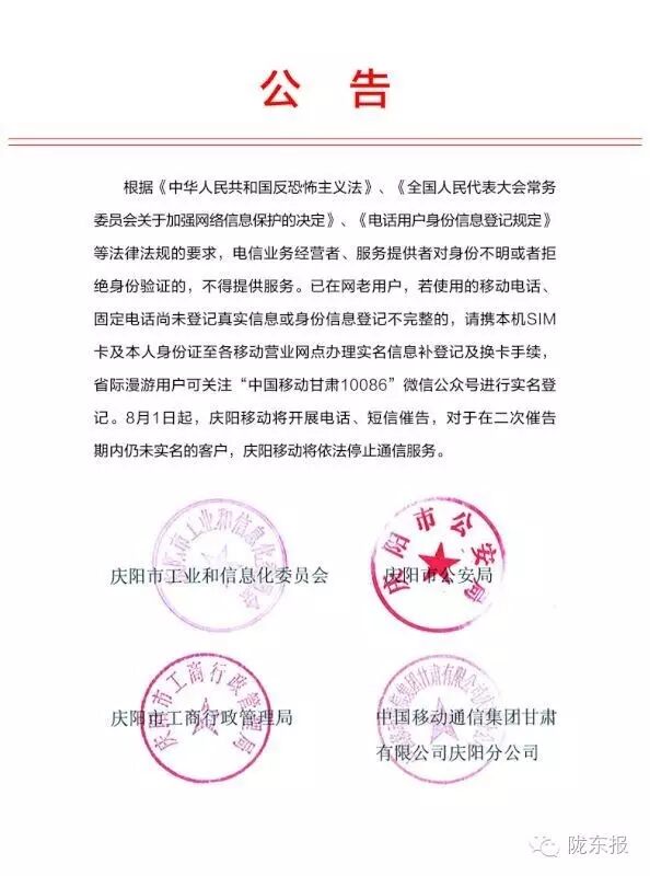 8月31日,陇东报/掌中庆阳记者从移动庆阳分公司、电信庆阳分公司、联通庆阳分公司运营商处获悉,对于未实名的手机卡用户,应尽快携带SIM卡、本人的身份证原件进行实名补登记,而未实名的手机卡或将无法缴费,将从9月1日起分批分次停机。