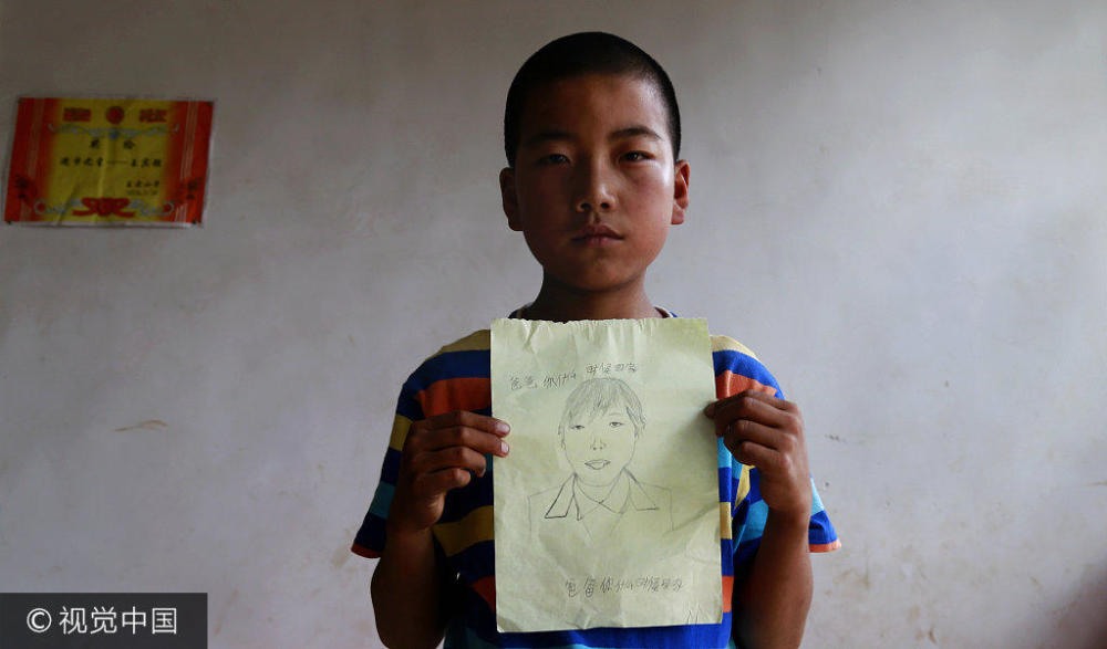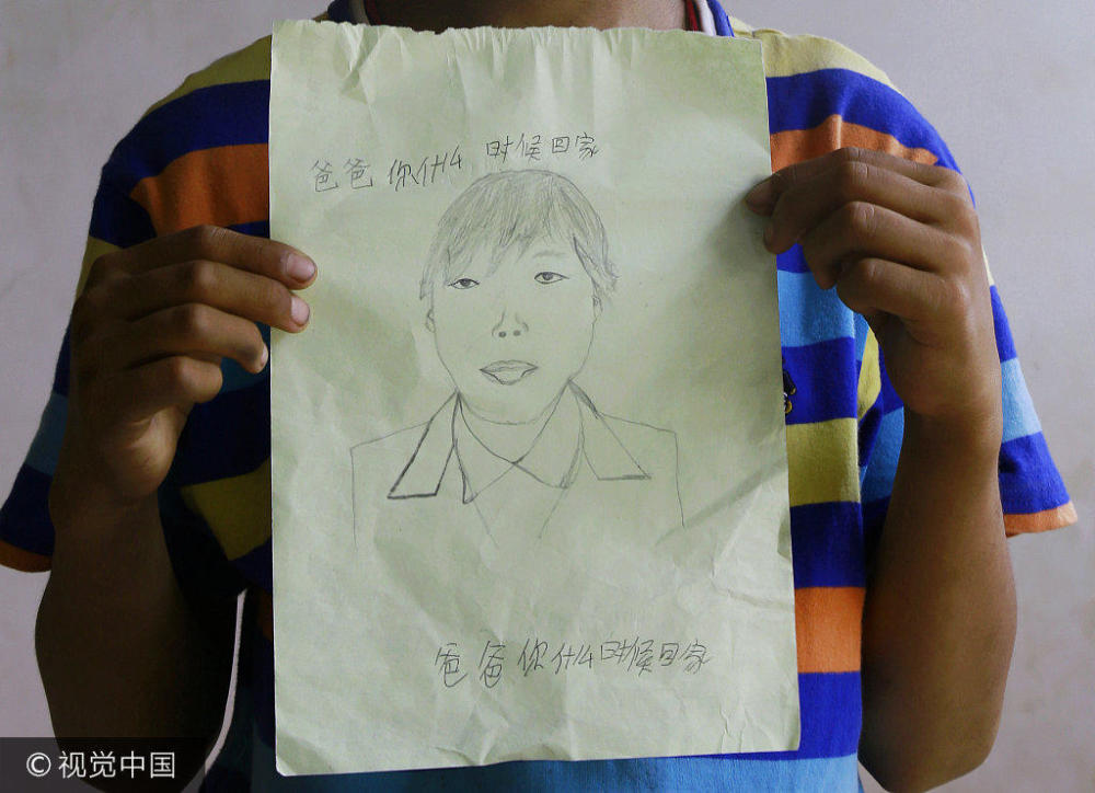 2017年7月22日,甘肃庆阳。爸爸他在哪呢?每当做完作业,一个人时,爸爸就走进了他的脑海,他多么想念爸爸啊!不由得又在本子上画起了照片中的爸爸,忍不住写到“爸爸,你什么时候回家?”五岁的时候,宾强就看着爸爸的照片在纸上画,思念的画笔不停的描绘着爸爸的样子。
