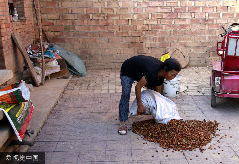 2017年7月22日,甘肃庆阳。懂事的孙子给了奶奶动力,老人家放下柴禾就去捡杏核,捡完杏核顺路给兔子剜青草,安顿好这些,天也黑了。