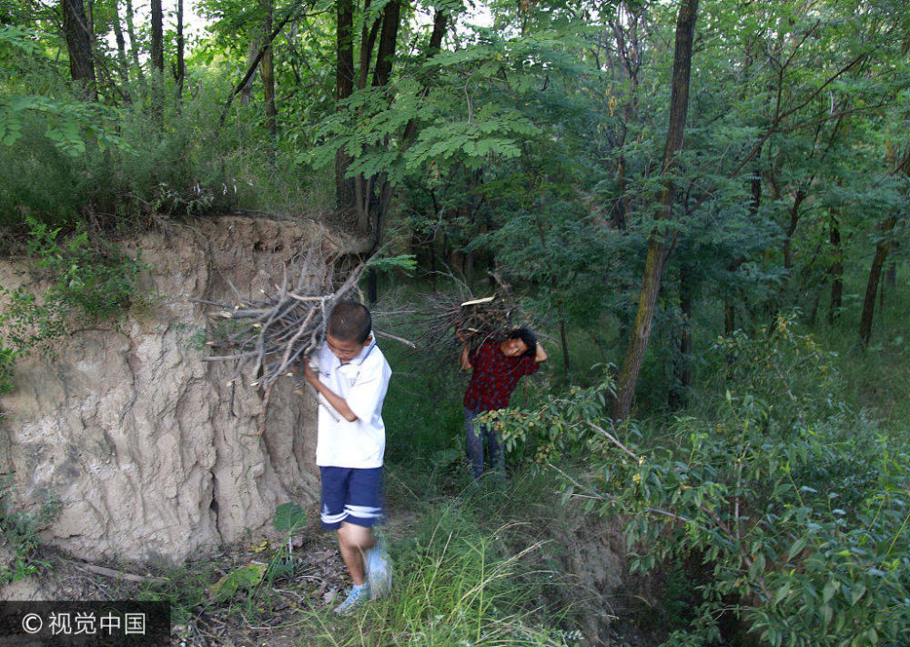 2017年7月22日,甘肃庆阳。12岁的孙子长得跟奶奶差不多一样高,看见奶奶去沟里捡柴禾,懂事的他跟着奶奶一起去扛,稚嫩的肩膀被枝条戳地生疼,也从不喊苦。
