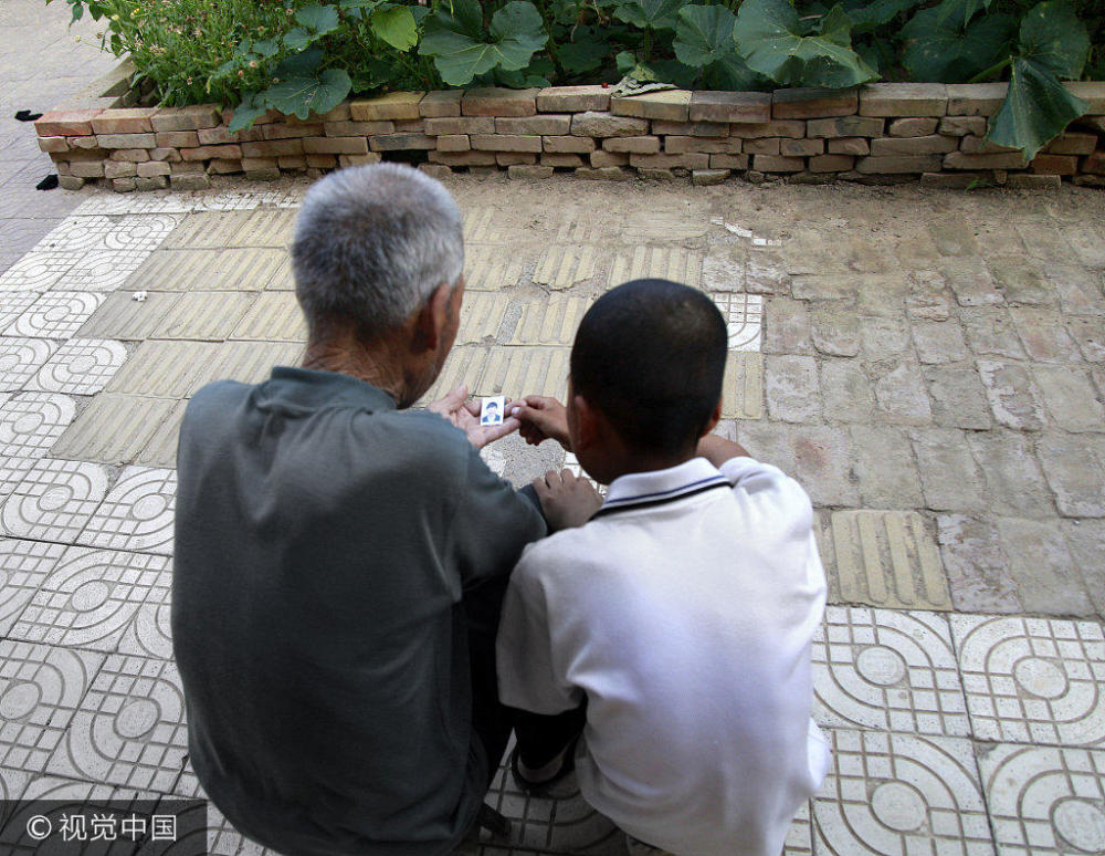 2017年7月22日,甘肃庆阳。20年前爷爷患了癫痫病。听奶奶说,病初,犯病很频繁,一天一次,有时一天至少两次。随着年龄增大,病倒不经常犯了,可神志不清、迷迷糊糊的状况却时常发生。宾强真的害怕爸爸有一天回来,爷爷不认识了。于是,常常把爸爸的照片放到爷爷手里,捉着爷爷的手,和爷爷一起看。每次爷爷都会问:“这是谁?”“爷爷,是我爸爸。”宾强说。