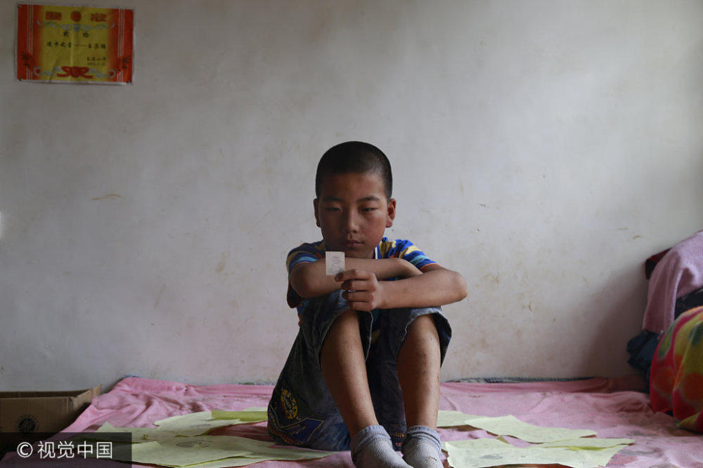 2017年7月22日,甘肃庆阳。王宾强,12岁,家住甘肃省正宁县宫河镇王录村。12年前,还在襁褓中的他仅40天,妈妈就弃他而去,杳无音信。1岁时,爸爸又不辞而别,至今未归,从奶奶的念叨中知道爸爸出门打工去了。想喊一声爸爸,想看看爸爸的模样,盼着爸爸回家,慢慢的从愿望变成了奢望。