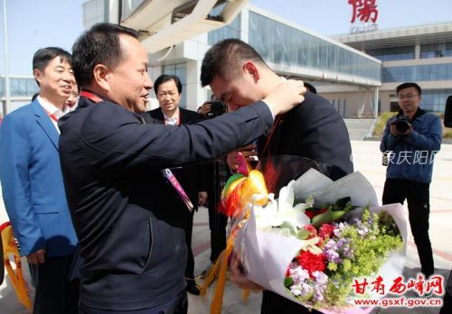 市委常委、统战部长、政法委书记赵昌军为机组人员赠送庆阳香包
