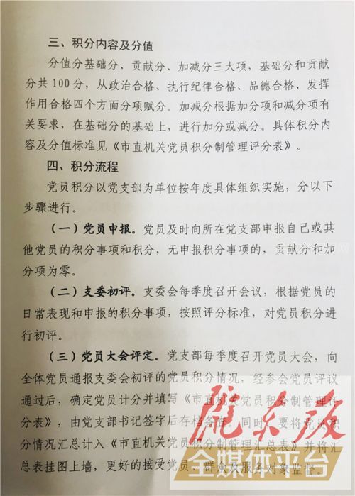 《通知》指出,积分制管理分值分基础分、贡献分、加减分三大项,基础分和贡献分共100分,从政治合格、执行纪律合格、品德合格、发挥作用合格四个方面分项赋分。加减分根据加分项和减分项有关要求,在基础分的基础上,进行加分或减分。党员积分以党支部为单位按年度具体实施,分党员申报、支委初评、党员大会评定、计算年度积分四个步骤进行。