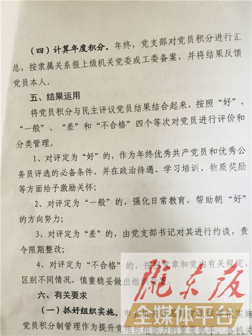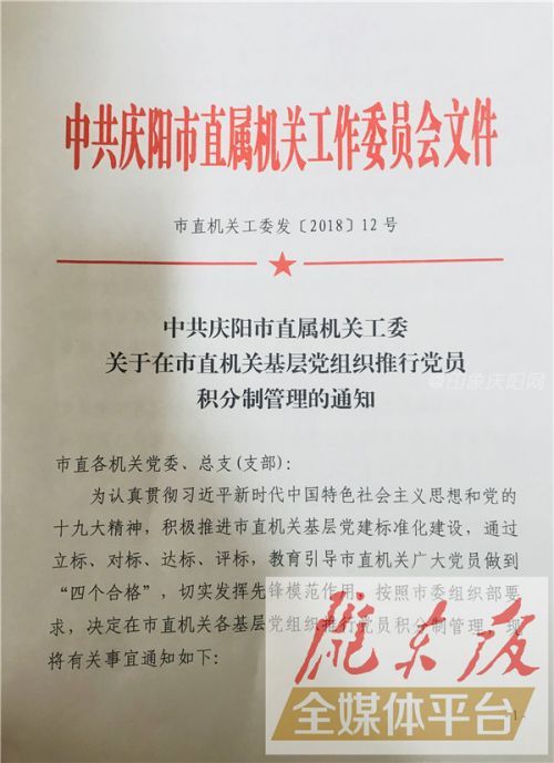 摘要:日前,市直机关工委下发了《中共庆阳市直属机关工委关于在市直机关基层党组织推行党员积分制管理的通知》(以下简称《通知》),决定在市直机关各基层党组织推行党员积分制管理,教育引导党员自觉践行“四个合格”,牢固树立“四个意识”,切实坚定“四个自信”,坚决做到“四个服从”。