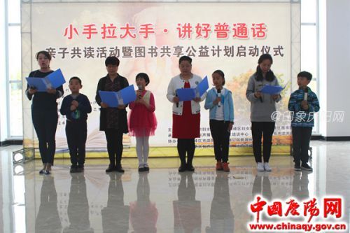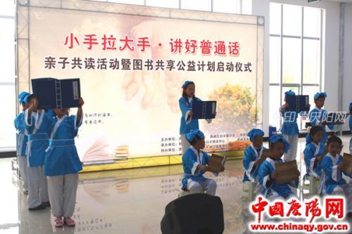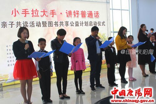 印象庆阳网讯:世界读书日来临之际,4月22日上午,庆阳市妇联、西峰区妇联、西峰区图书馆、朗朗有声播音主持口才培训中心联合举办了“小手拉大手·讲好普通话”亲子共读活动。100多名参加活动的家长、孩子以及现场群众在“亲子共读签名墙”上签名,承诺“放下手机、拿起书本,在亲子共读中培育良好家风,在书香墨韵中建设书香庆阳。“小手拉大手·讲好普通话”亲子共读活动以《经典吟唱》正式开场。