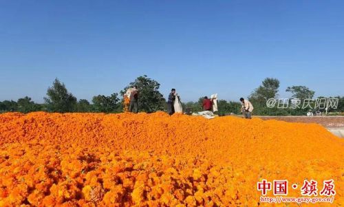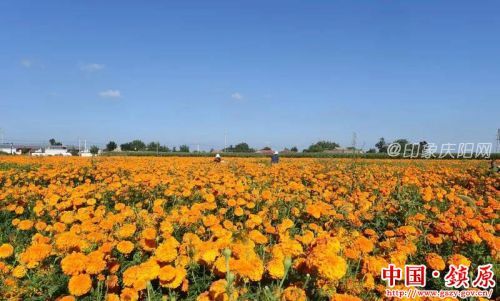 印象庆阳网讯:日前,镇原县孟坝镇峁合、塬口、东庄等村组平原上、坡地里,放眼望去,到处都是一片橙黄色,金灿灿的万寿菊竞相绽放,成为一片片金色花海。田间地头,到处是花农忙碌采摘的身影;收购点上,花农有序售花。田间小径上群群游人喜笑颜开,拍照、体验摘花,不亦乐乎。