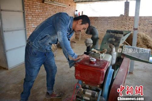罗望民没有因残而颓废,带假肢外出打工。图为他正在维修铡草机。 李文 摄