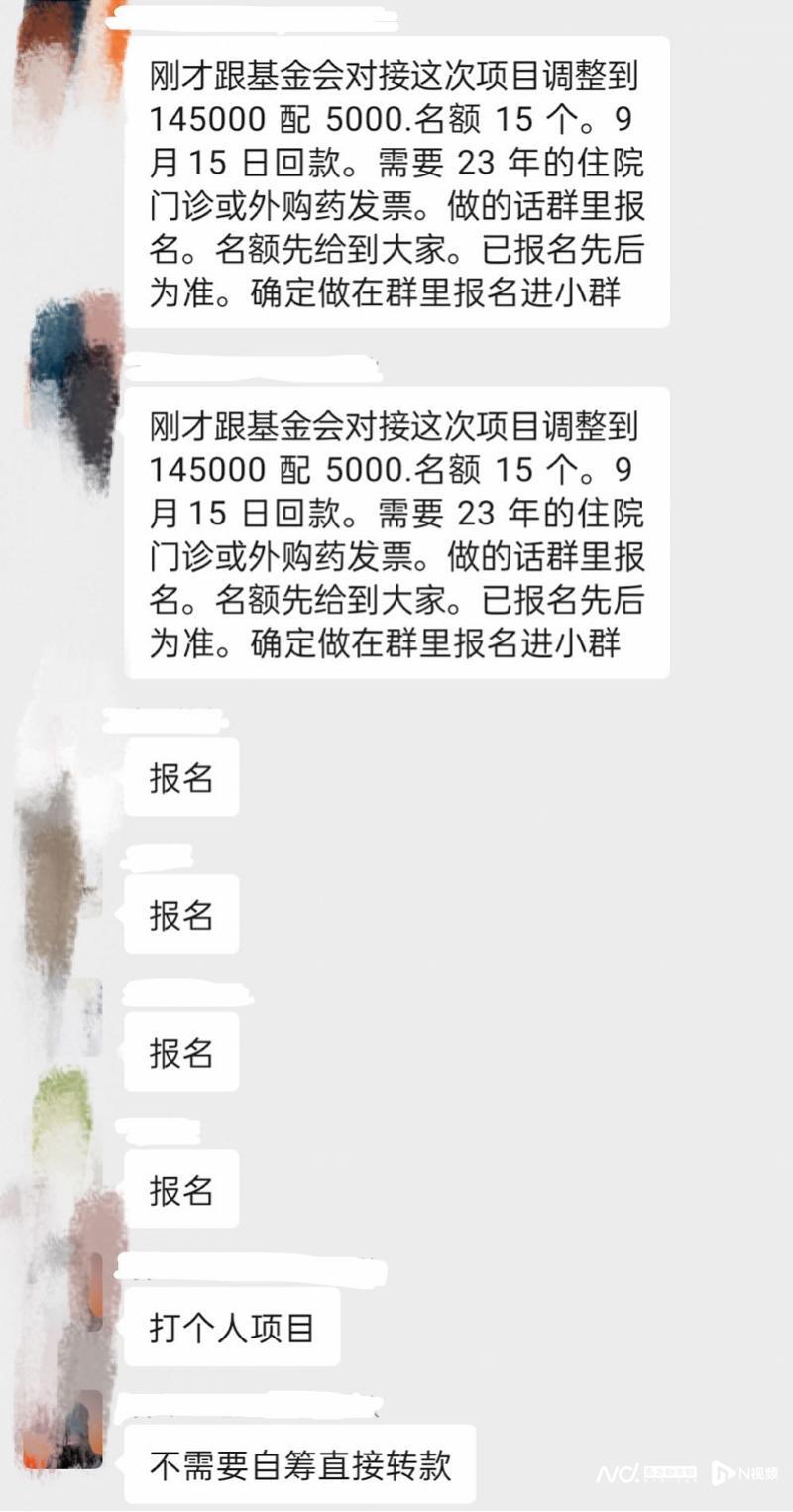 在大病患儿家长群体中,以老乡、(邻床或同医院的)病友为基础建立起来的关系网络很常见。患儿家长微信群里不时会有自称是某某慈善公益项目的“工作人员”转发配捐项目,每次配捐项目的名额和金额不同,有102000元配捐2000元的,也有145000元配捐5000元的,项目名额在3至20个不等,患儿家长们往往需要靠“抢”才能争取到名额。