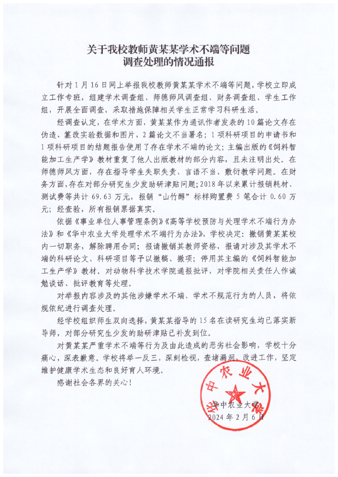 2月6日,华中农业大学通报教师黄某某学术不端等问题调查处理情况:撤销黄某某校内一切职务,解除聘用合同。