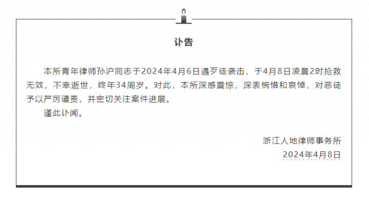 4月8日,浙江人地律师事务所发布讣告:本所青年律师孙沪同志于2024年4月6日遇歹徒袭击,于4月8日凌晨2时抢救无效,不幸逝世,终年34周岁。