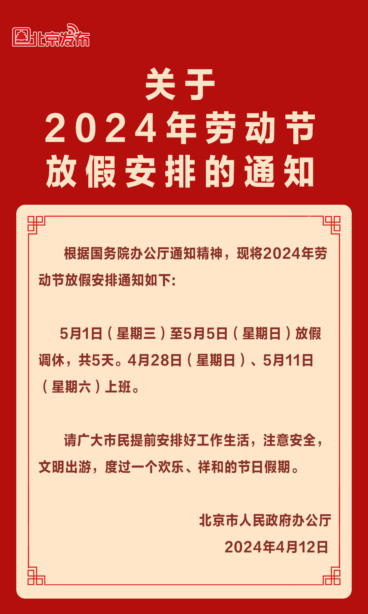 新京报讯 据“北京发布”官微消息,北京市人民政府办公厅正式发布关于2024年劳动节放假安排的通知:5月1日至5月5日放假调休,共5天。4月28日、5月11日上班。