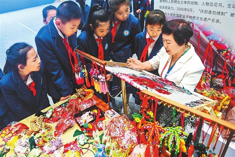 9月22日,庆阳香包刺绣展位非遗传承人给孩子们展示刺绣技艺。(记者丁凯)