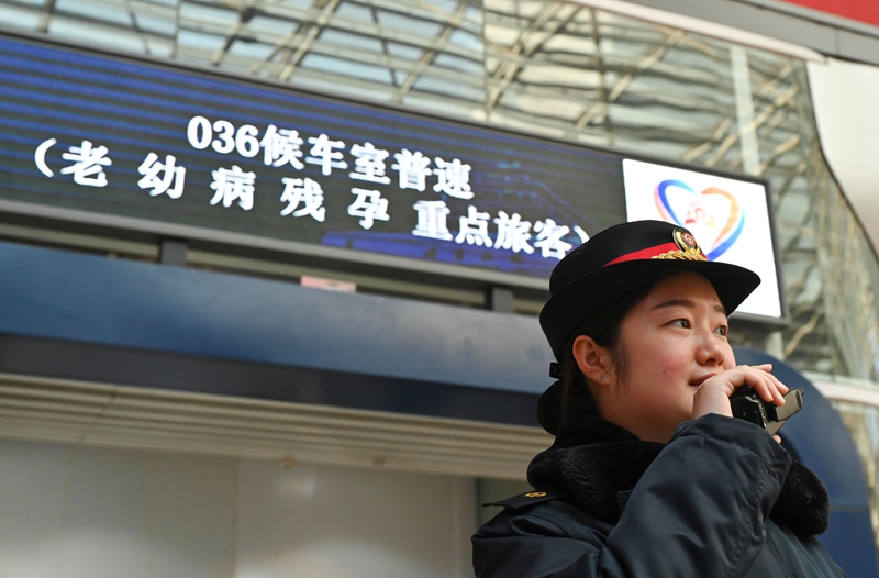 2025年2月18日,北京西站“036候车室”客运员冯雪通过对讲机和同事沟通工作。新华社记者 任鹏飞 摄
