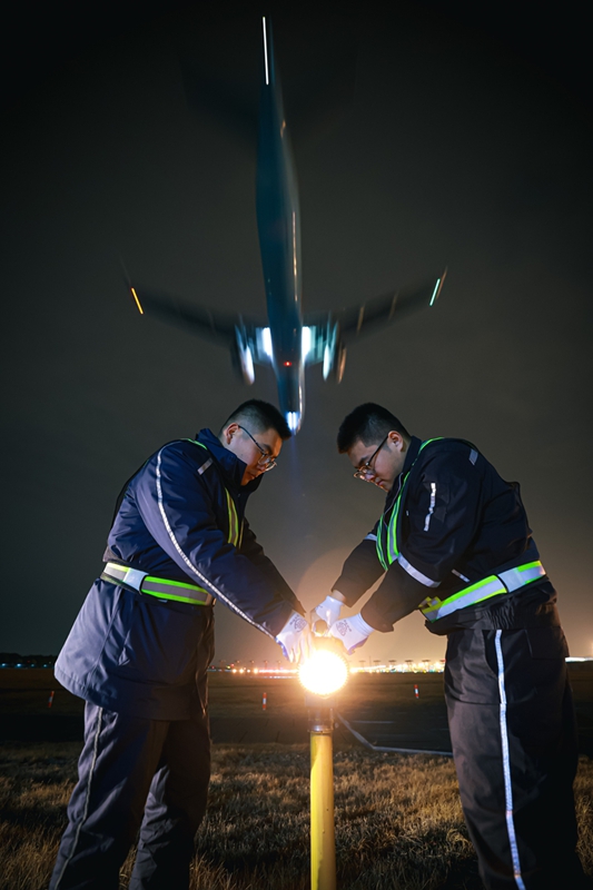 2025年1月24日晚,杭州萧山国际机场助航灯光机务员朱仁杰(左)与徒弟陈正昂在飞行区内检修进近灯。新华社记者 江汉 摄