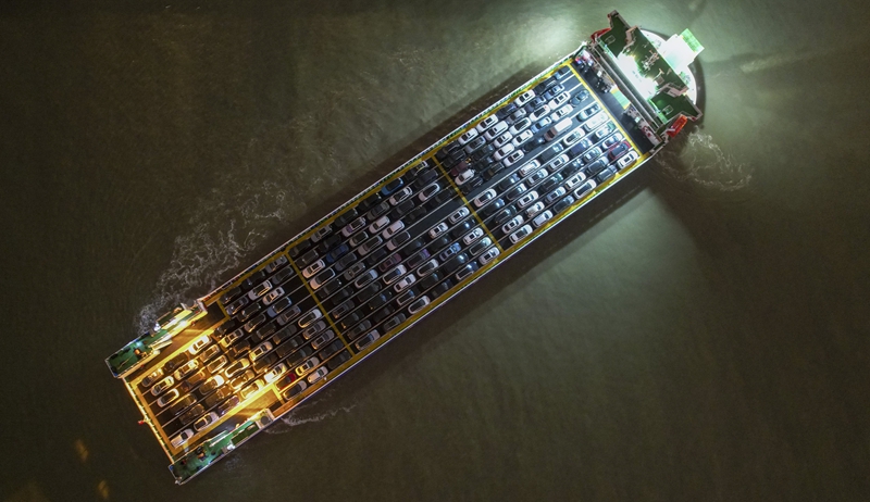 新能源车专用运输船“绿源二号”装载完成后驶离海南省海口市秀英港(2025年1月26日摄,无人机照片)。新华社记者 杨冠宇 摄