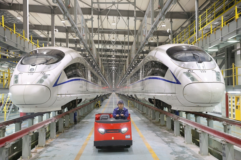 2025年1月14日,动车组列车在铁路天津动车客车段动车运用所停车场整装待发(无人机照片)。新华社记者 李然 摄