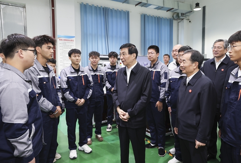 9月26日,受习近平总书记嘱托,中共中央政治局常委、全国政协主席、中央代表团团长王沪宁带领中央代表团部分成员到新疆生产建设兵团第二师铁门关市、第十师北屯市考察。这是王沪宁和中央代表团部分成员在兵团兴新职业技术学院考察职业教育发展情况。新华社记者 姚大伟 摄