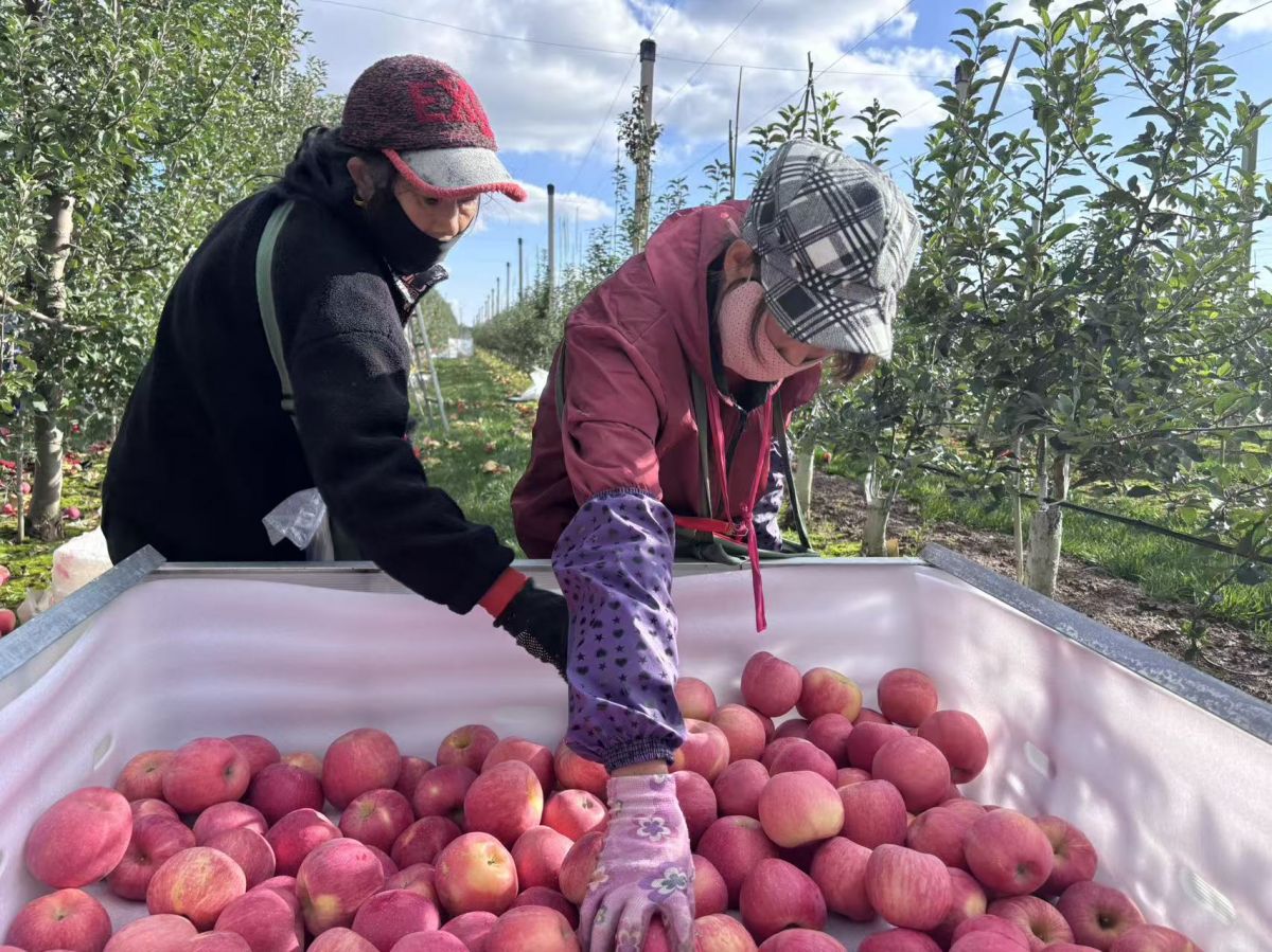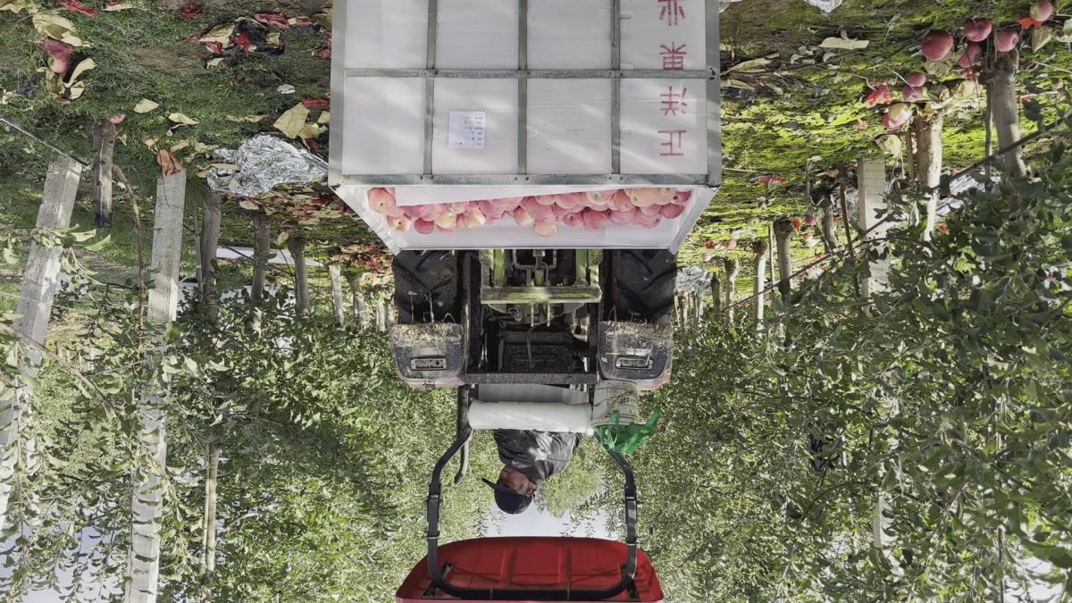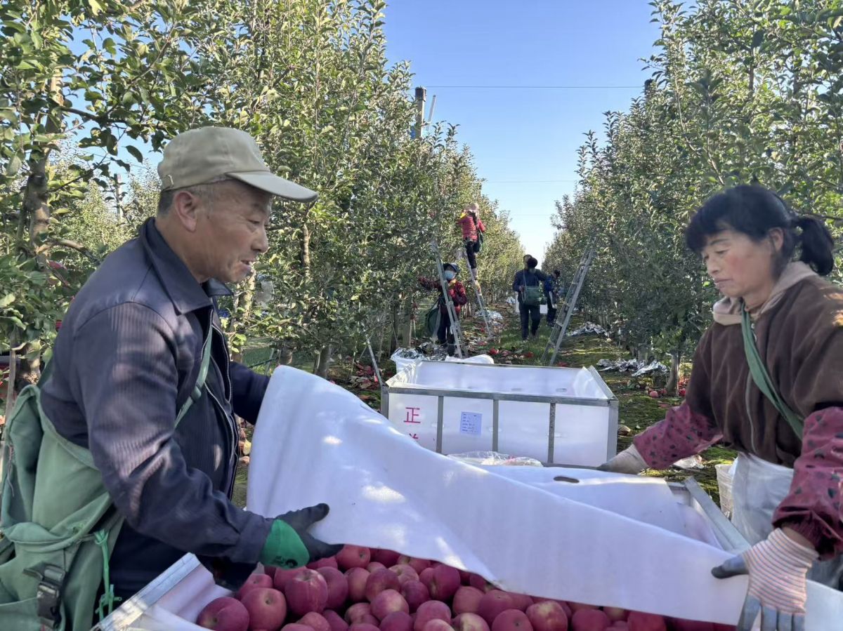 转运箱旁,几个果农双手在苹果间飞快舞动,眼神专注如炬,指尖轻抚过每个果实,将优质苹果迅速分拣出来。不远处,叉车引擎的轰鸣声不绝于耳,机械臂起落频繁,刚装满的转运箱转眼就被稳稳托起,驶出果园。整个果园跃动着争分夺秒的节奏,连空气都弥漫着与时间赛跑的紧张气息。