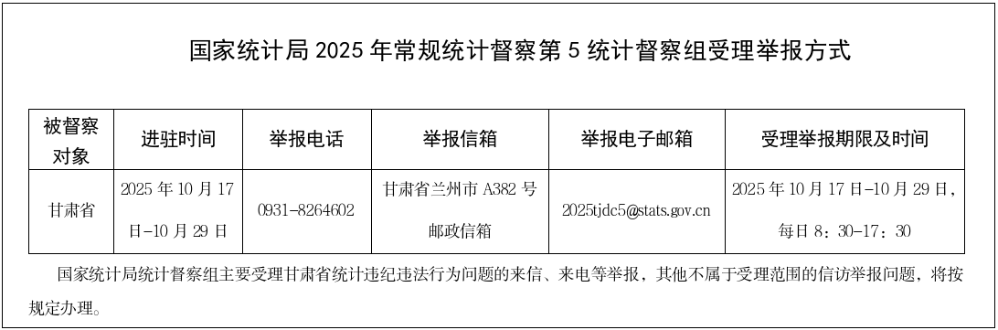 摘要:根据党中央和国务院授权,国家统计局2025年常规统计督察第5统计督察组近日进驻甘肃省开展统计督察,并于10月17日与省委、省政府进行对接沟通。督察组组长、国家统计局党组成员、副局长毛盛勇通报统计督察事宜,提出工作要求。省委书记、省人大常委会主任胡昌升参加对接沟通并讲话。省委副书记、省长任振鹤参加对接沟通。