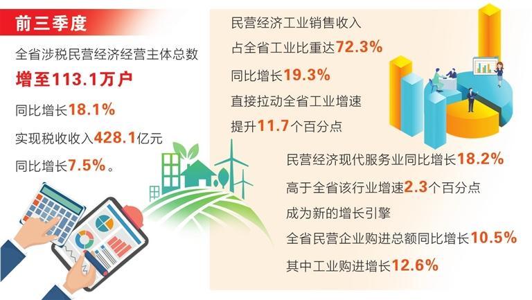 摘要:税收数据显示,前三季度,全省涉税民营经济经营主体总数增至113.1万户,同比增长18.1%;实现税收收入428.1亿元,同比增长7.5%。全省民营经济继续保持稳中有进、向上向好的发展态势。