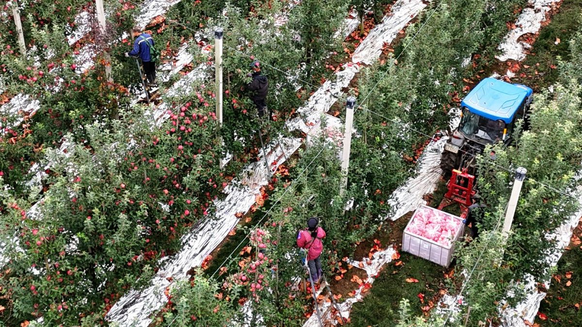 群众正在正洋苹果基地采摘晚熟苹果