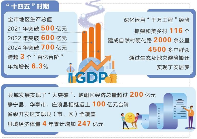 5年来,平凉经济总量实现了“三级跳”,全市地区生产总值2021年突破500亿元、2022年突破600亿元、2024年突破700亿元,跨越3个“百亿台阶”,年均增长6.3%,预计今年达到750亿元以上。县域发展实现了“大突破”,崆峒区经济总量超过200亿元,静宁县、华亭市、庄浪县相继迈上100亿元台阶,省级开发区实现县(市、区)全覆盖,县域经济体量4年累计增加247亿元。