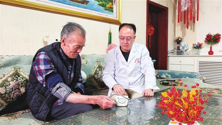 古浪县西靖镇阳光新村村医上门为村民测量血压。