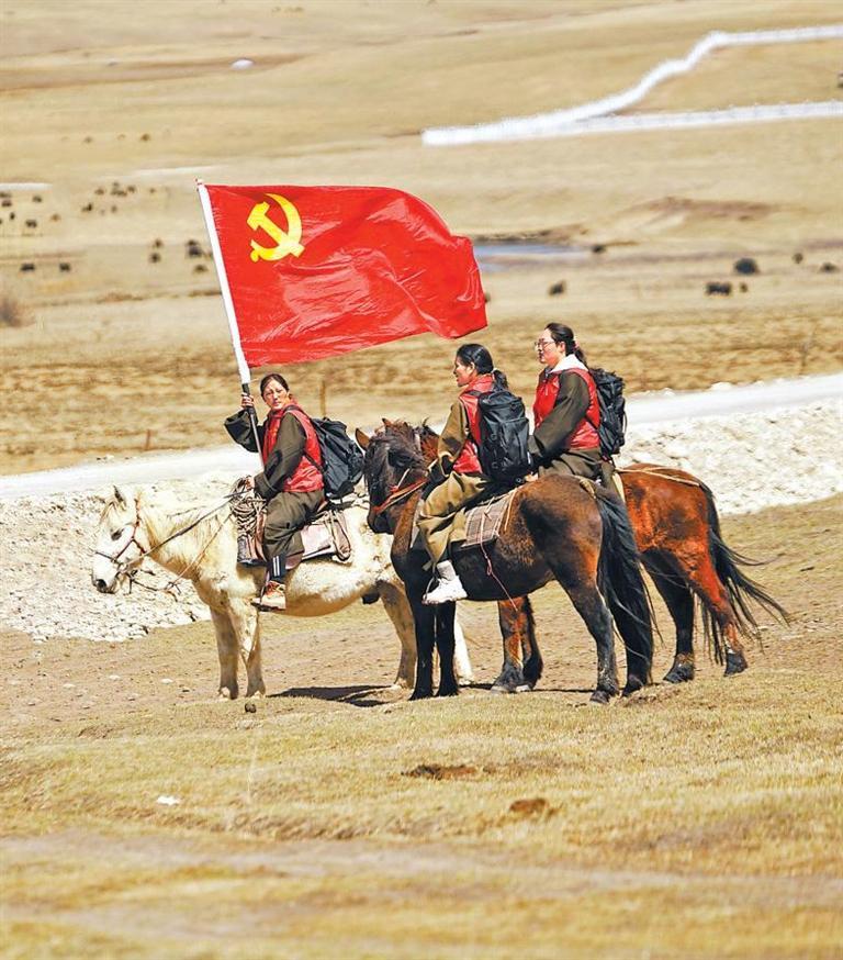 玛曲县齐哈玛镇女子马背宣讲队深入草原宣讲。(通讯员后俊)