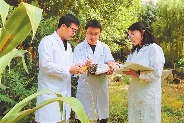甘肃农业大学学生在“百草园”里观察农作物生长情况。(通讯员郑芃生)