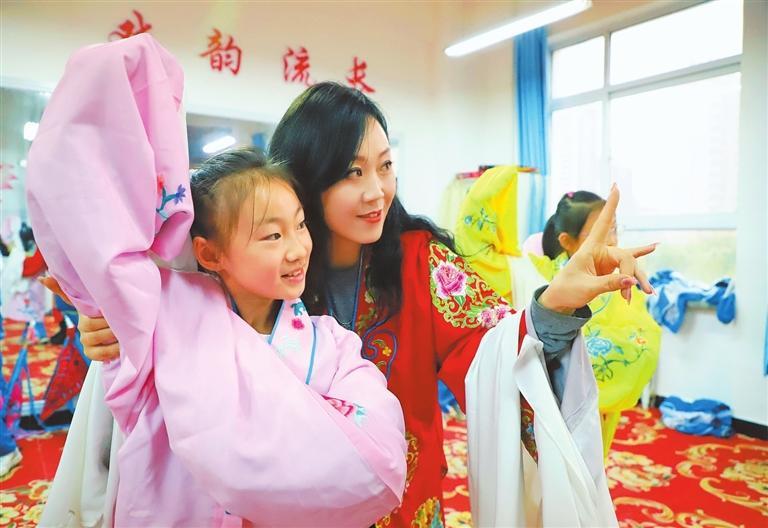 静宁县实验小学戏曲社团教师指导学生表演戏曲。
