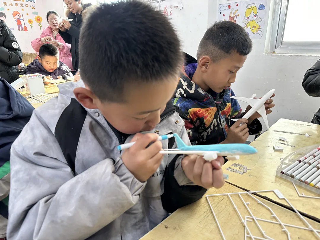 打印完成后,教室变身热闹的实践课堂。工作队队员与孩子们分组协作,手把手指导拼装飞机零部件,细致讲解机身、机翼、尾翼的功能与配合原理;调色盘、画笔整齐排列,孩子们尽情发挥想象,为飞机涂上斑斓色彩,有的绘上民航标志,有的勾勒蓝天白云,还有的写下“我的航天梦”“新年加油”的字样。“这是我第一次亲手做飞机模型,还弄懂了飞机飞行的秘密!”六年级学生罗文泽捧着专属的“梦想飞机”,脸上洋溢着自豪的笑容。