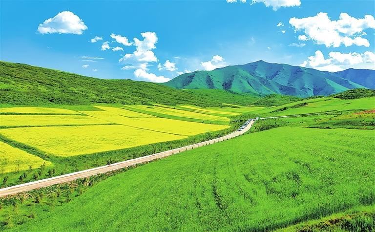 天祝县哈溪镇大尖山沟,林区、村庄、农田构成美丽画卷。
