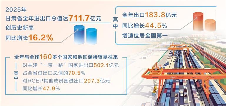 摘要:记者近日从兰州海关召开的新闻发布会上获悉,2025年甘肃省全年进出口总值首次突破700亿元,达711.7亿元,创甘肃省有进出口统计数据以来的最高纪录,同比增长16.2%,增速位居全国第六。其中,全年出口183.8亿元,同比增长44.5%,增速位居全国第一。