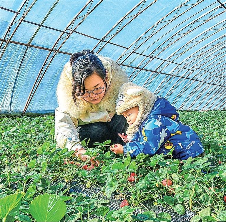 市民在文殊镇采摘草莓。(李巍)