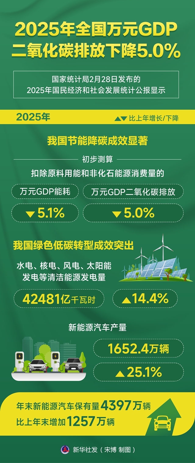 国家统计局2月28日发布的2025年国民经济和社会发展统计公报显示,2025年我国节能降碳成效显著,初步测算,扣除原料用能和非化石能源消费量的万元GDP能耗比上年下降5.1%,万元GDP二氧化碳排放下降5.0%。