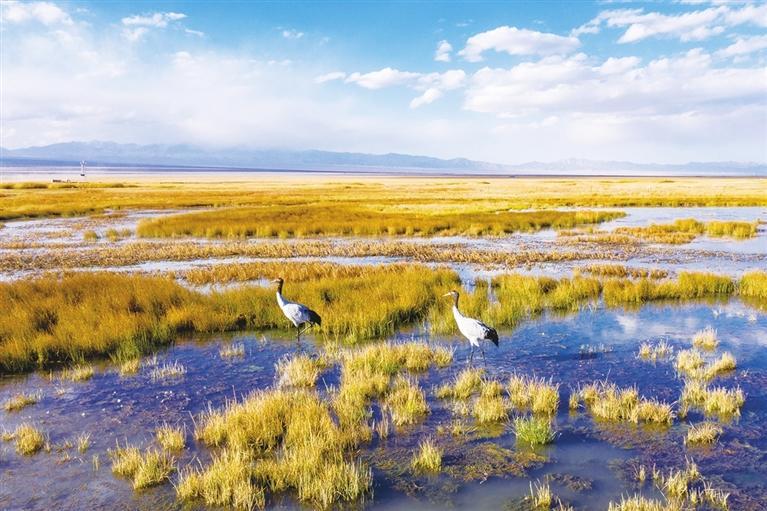 黑颈鹤漫步阿克塞苏干湖湿地。(高宏善)