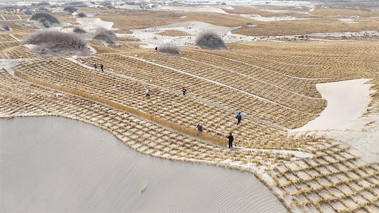 防沙治沙,久久为功。在金塔县巴丹吉林沙漠西缘,治沙现场一派热火朝天的景象:两人一组、挥锹培土,将一株株梭梭、柽柳苗木栽进沙坑;无人机腾空而起,将一捆捆稻草精准运送到治沙腹地;纵横交错的草方格如金色网格,牢牢锁住流动沙丘;高立式沙障挺立沙丘,筑起一道道防沙“长城”。从传统“人海战术”到“高科技与机械化并举”,从单一人工压沙到工程治沙、生物治沙相结合,酒泉市不断创新治沙技术,推广草方格沙障、戈壁客土造林、滴灌节水造林等技术,林木成活率大幅提升,治沙效率显著提高。