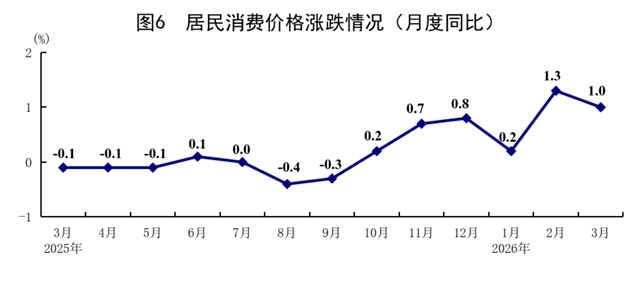 一季度,全国居民消费价格(CPI)同比上涨0.9%,涨幅比上年四季度扩大0.4个百分点。分类别看,食品烟酒及在外餐饮价格同比上涨0.5%,衣着价格上涨1.8%,居住价格下降0.2%,生活用品及服务价格上涨2.3%,交通通信价格下降1.1%,教育文化娱乐价格上涨1.0%,医疗保健价格上涨1.8%,其他用品及服务价格上涨14.1%。在食品烟酒及在外餐饮价格中,猪肉价格下降11.3%,粮食价格下降0.3%,鲜果价格上涨4.3%,鲜菜价格上涨7.6%。扣除食品和能源价格后的核心CPI同比上涨1.2%。3月份,全国居民消费价格同比上涨1.0%,环比下降0.7%。