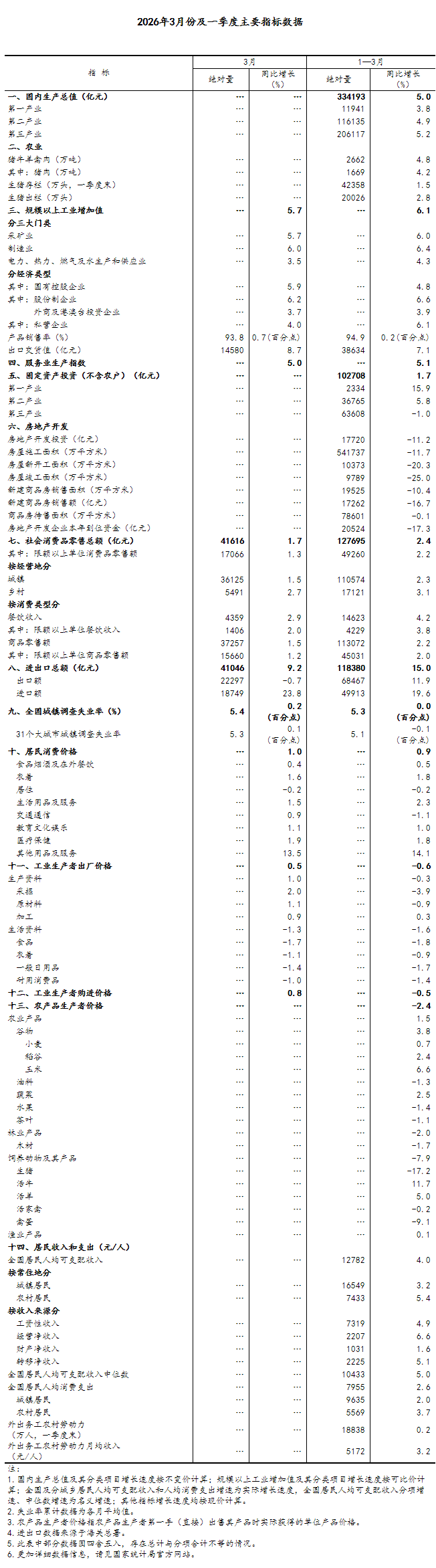 (1)国内生产总值及其分类项目增长速度按不变价计算,规模以上工业增加值及其分类项目增长速度按可比价计算,均为实际增长速度;其他指标除特殊说明外,按现价计算,为名义增长速度。