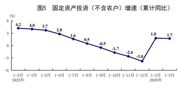 一季度,全国固定资产投资(不含农户)102708亿元,同比增长1.7%,上年全年为下降3.8%;扣除房地产开发投资,全国固定资产投资增长4.8%。分领域看,基础设施投资同比增长8.9%,制造业投资增长4.1%,房地产开发投资下降11.2%。全国新建商品房销售面积19525万平方米,同比下降10.4%;新建商品房销售额17262亿元,下降16.7%。分产业看,第一产业投资同比增长15.9%,第二产业投资增长5.8%,第三产业投资下降1.0%。民间投资同比下降2.2%,降幅比上年全年收窄4.2个百分点;扣除房地产开发投资,民间投资增长1.3%。高技术产业投资同比增长7.4%,其中计算机及办公设备制造业,航空、航天器及设备制造业,信息服务业投资分别增长28.3%、19.0%、20.9%。3月份,固定资产投资(不含农户)环比增长0.52%。
