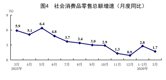 一季度,社会消费品零售总额127695亿元,同比增长2.4%,比上年四季度加快0.7个百分点。按经营单位所在地分,城镇消费品零售额110574亿元,同比增长2.3%;乡村消费品零售额17121亿元,增长3.1%。按消费类型分,商品零售额113072亿元,增长2.2%;餐饮收入14623亿元,增长4.2%。基本生活类和部分升级类商品销售增长较快,限额以上单位粮油食品类、服装鞋帽针纺织品类、通讯器材类、金银珠宝类商品零售额同比分别增长10.0%、9.3%、20.8%、12.6%。3月份,社会消费品零售总额同比增长1.7%,环比增长0.14%。一季度,服务零售额同比增长5.5%,增速与上年全年持平。其中,通讯信息服务类、旅游咨询租赁服务类、文体休闲服务类零售额较快增长。一季度,全国网上商品和服务零售额49774亿元,同比增长8.0%。其中,网上商品零售额31614亿元,增长7.5%,占社会消费品零售总额的比重为24.8%;网上服务零售额18160亿元,增长8.8%。