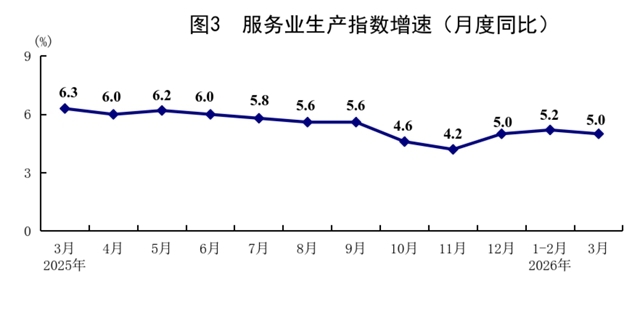 一季度,服务业增加值同比增长5.2%。其中,租赁和商务服务业,信息传输、软件和信息技术服务业,金融业,交通运输、仓储和邮政业,住宿和餐饮业增加值分别增长12.2%、10.6%、6.5%、4.3%、4.3%。3月份,全国服务业生产指数同比增长5.0%。其中,信息传输、软件和信息技术服务业,租赁和商务服务业,金融业生产指数分别增长11.8%、10.1%、6.7%。1—2月份,规模以上服务业企业营业收入同比增长7.4%。3月份,服务业商务活动指数为50.2%,比上月上升0.5个百分点;服务业业务活动预期指数为54.8%。其中,铁路运输、电信广播电视及卫星传输服务、货币金融服务、保险等行业商务活动指数位于55.0%以上较高景气区间。