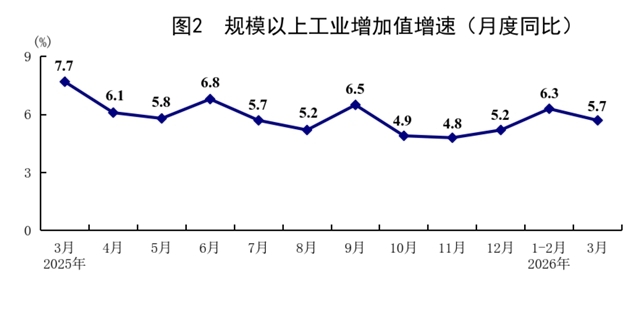 一季度,全国规模以上工业增加值同比增长6.1%,比上年四季度加快1.1个百分点。分三大门类看,采矿业增加值同比增长6.0%,制造业增长6.4%,电力、热力、燃气及水生产和供应业增长4.3%。装备制造业增加值同比增长8.9%,高技术制造业增加值增长12.5%,分别快于全部规模以上工业增加值2.8和6.4个百分点。分经济类型看,国有控股企业增加值同比增长4.8%;股份制企业增长6.6%,外商及港澳台投资企业增长3.9%;私营企业增长6.1%。分产品看,3D打印设备、锂离子电池、工业机器人产品产量同比分别增长54.0%、40.8%、33.2%。3月份,规模以上工业增加值同比增长5.7%,环比增长0.28%。3月份,制造业采购经理指数为50.4%,比上月上升1.4个百分点;企业生产经营活动预期指数为53.4%。1—2月份,全国规模以上工业企业实现利润总额10246亿元,同比增长15.2%。